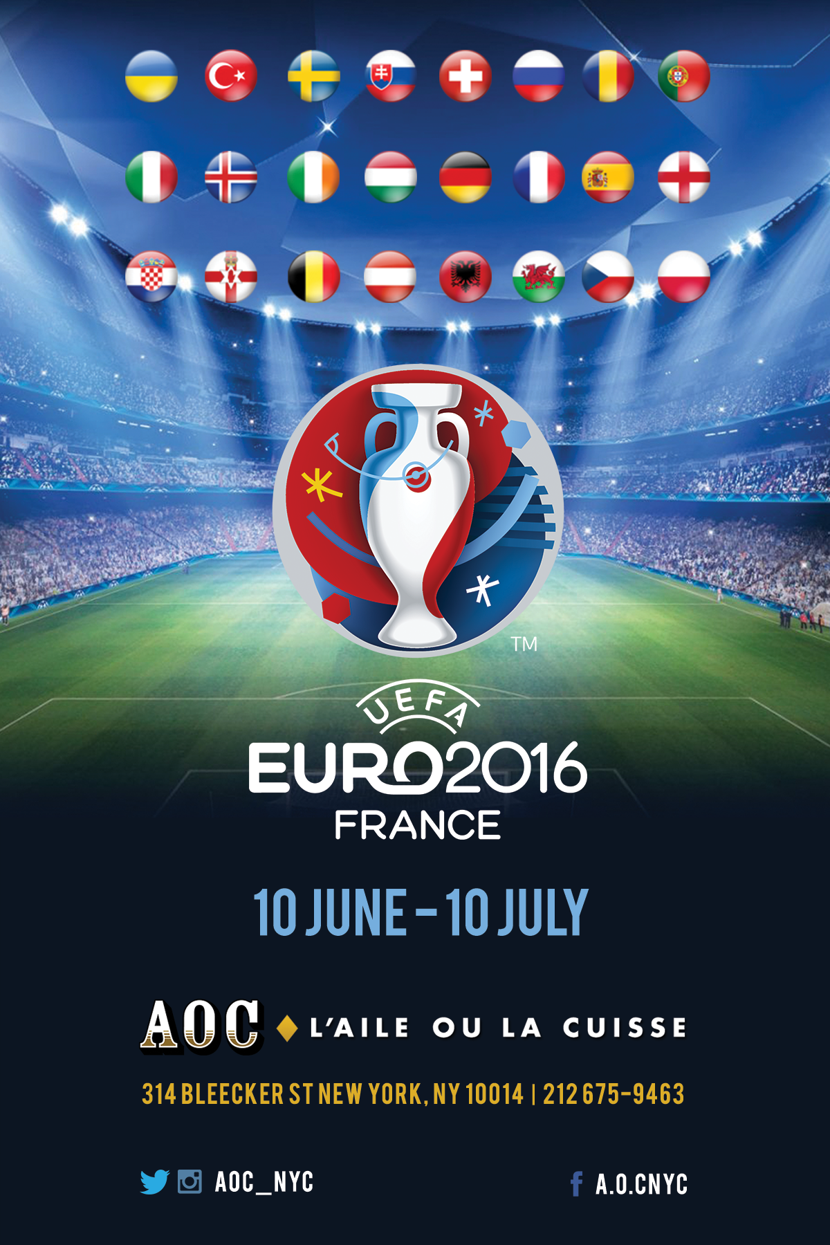 • AOCNYC wanted to promote EURO2016 Soccer Games on their business hours. A Flyer & Banner was design.