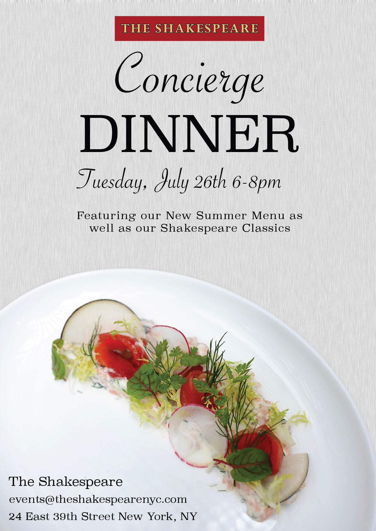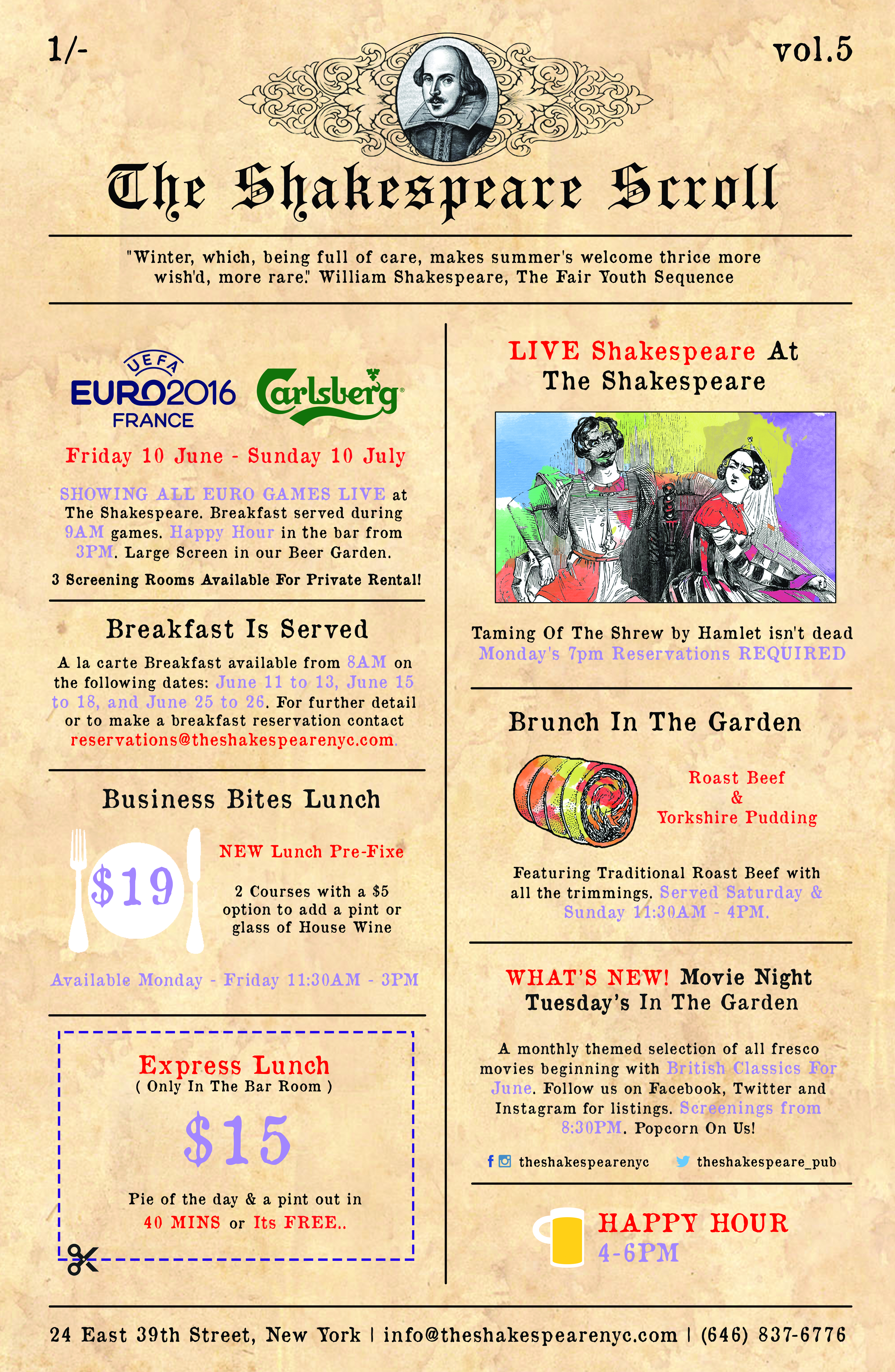 - The Shakespeare Scroll flyer is a monthly special in the restaurant.